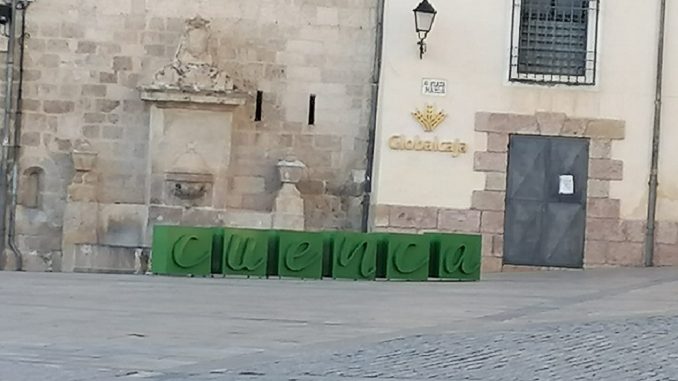 Ya se ha colocado en Plaza Mayor uno de los tres grandes letreros «identificativos de la ciudad » que el Ayuntamiento de Cuenca anunció que iba a instalar en el Casco Antiguo. Reproduce la palabra Cuenca con seis cubos en los que se enmarcan sendas letras, todas en minúsculas y con una tipografía informal, ligeramente en cursiva. Tanto el recuadro como los caracteres son de color verde, con los segundos sobresaliendo en relieve.
