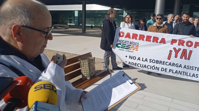 El Sindicato Médico ha denunciado que no hay suficientes médicos para cubrir las bajas en las zonas rurales de la provincia de Cuenca. Lo ha dicho el delegado sindical Javier Llavador esta mañana durante la concentración ante las puertas del Hospital Universitario convocada dentro de la cuarta jornada de huelga en toda España.