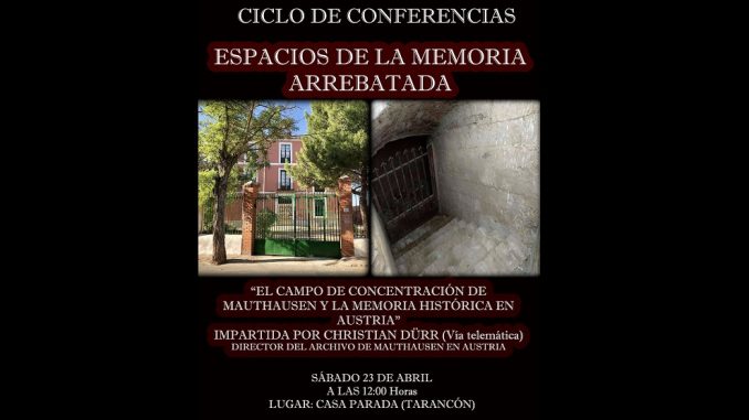 El próximo sábado 23 de abril a las 12:00 horas en Casa Parada de Tarancón, tendrá lugar la segunda conferencia del ciclo Espacios de la Memoria Arrebatada, organizado por ARMHCUENCA, El campo de Concentración de Mauthausen y la Memoria Histórica en Austria, impartida por Christian Dürr, curador del Mauthausen Memorial, en cuya biblioteca se pueden consultar nuestros fanzines y el libro Tarancón Rojo, Red Tarancón.