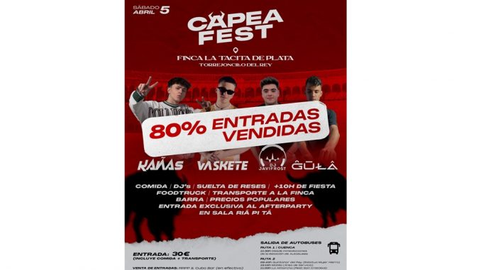 La localidad de Torrejoncillo del Rey situada a apenas 30 minutos de Cuenca capital, contará con una espectacular capea el próximo 5 de abril. Se trata de la primera edición del evento `Capea Fest´. Bien es verdad, que varios de los organizadores, ya cuentan con una amplia experiencia en el sector de los eventos. De hecho, ya el año pasado algunos de ellos estuvieron implicados en la organización de `La Capechaska´.