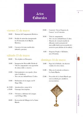 Un año más podemos contar con nuestros amigos de Conca, que consiguen trasladarnos a otraépoca, habrá mercadillo medieval, donde podre disfrutar y comprar artesanías únicas y originales. La “Joven Orquesta de Cuenca”, hará que nos deleitemos con sus notas en el incomparable marco del Convento. Y por la noche en el Frontón, Orquesta People +Dj Ibañez, entrada gratuita, y muchísimas cosas más.